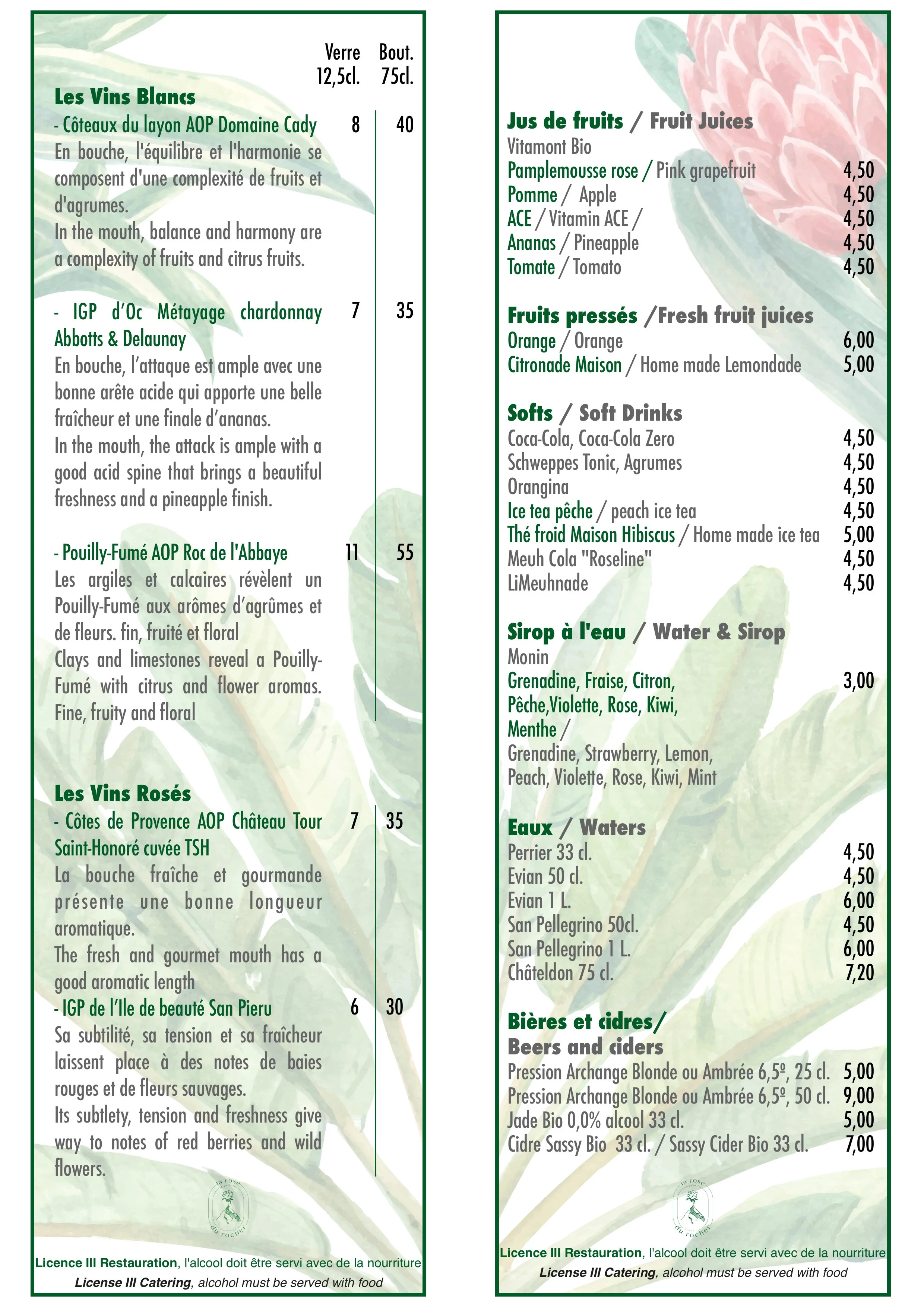 Dejeuner / Lunch service 12:00 p.m. à / to 2:30 p.m.